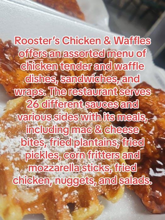 Had a great experience trying out Rooster's Chicken & Waffles tonight. We ordered primarily chicken and waffles and mozzarella sticks. The coating on the chicken is amazing and crunchy with moist chicken. The fries were perfectly seasoned and the mozzarella sticks were fried perfectly too. Everything balanced out with the delicious waffles which have the crunchy bursts of sugar in them. I highly recommend this as a chicken sandwich and tender stop .
